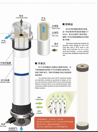 Ultrafiltracyjne uzdatnianie wody to technologia separacji membranowej pomiędzy mikrofiltracją i nanofiltracją. Wykorzystuje różnicę ciśnień jako siłę napędową, wykorzystując membrany z pustych włókien o wielkości porów 0,01–0,1 μm do przechwytywania koloidów, bakterii, wirusów i części materii organicznej w wodzie. Jego podstawowe zalety to: